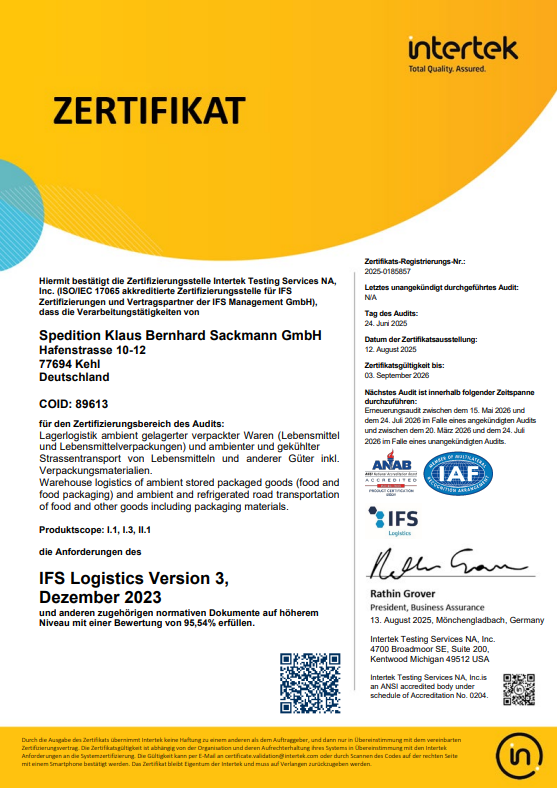 Die Spedition Klaus Bernhard Sackmann GmbH ist stolz darauf, nach dem IFS Logistics 2.3 (International Featured Standard) zertifiziert zu sein.